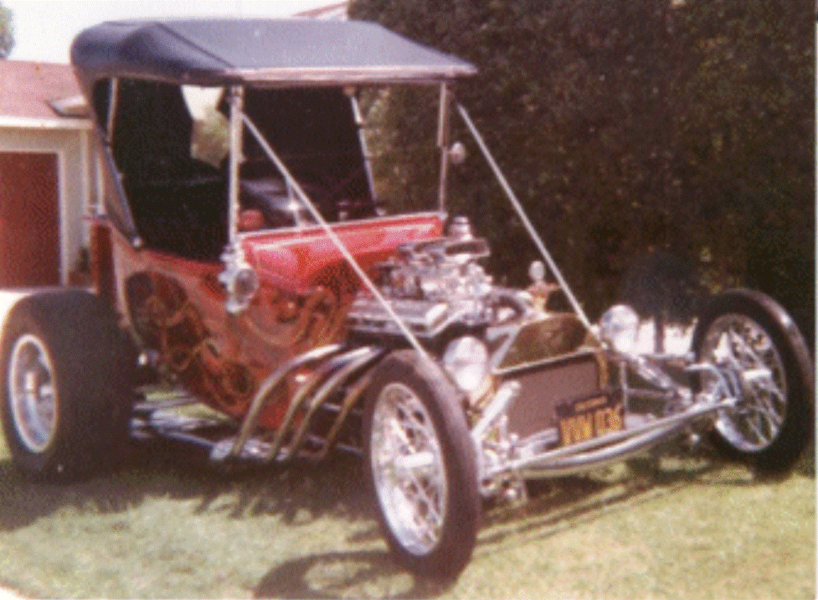 That car had been a Prowler,  but Bob wasn’t one until 1967 after 7 long years of building a family and a new model “T”.  This one was a 1923 roadster pickup with wild flames by Robert Martinez.  No fiberglass for Bob,  The car had extensive body work by Kenny Eldred and a Cushman bed.  It ended up in the pages of “Rod and Custom” in 1970.
